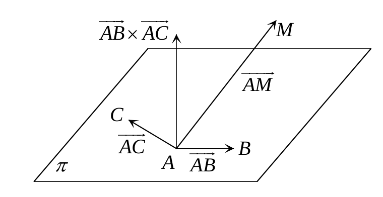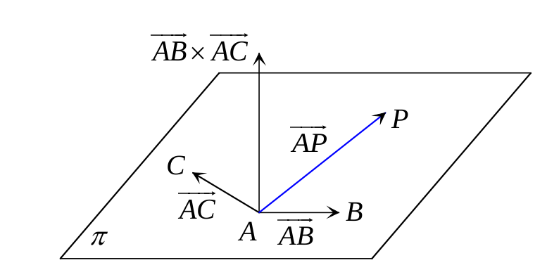 \[ A= (a_1,a_2,a_3) \in \pi\\\\ \vec{u} = \begin{pmatrix}u_1\\u_2\\u_3\end{pmatrix}, \vec{v} = \begin{pmatrix}v_1\\v_2\\v_3\end{pmatrix} \in \pi \quad \text { t.q. }\space \vec{u} \neq \lambda \vec{v} , \quad\forall \lambda \in \mathbb{R} \]
