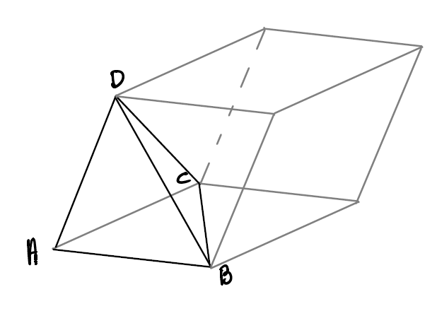 Le volume d’un tétraèdre \(ABCD\) construit sur les vecteurs \(\overrightarrow {AB}, \overrightarrow{AC}, \overrightarrow{AD}\) vaut \(\frac{1}{6}\) du volume d’un parallélépipède construit sur les même vecteur.