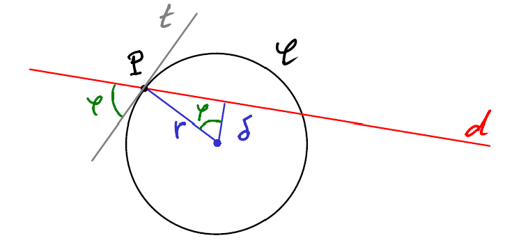 D’après la figure ci-dessus, on a que \(\cos\varphi = \frac{\delta}{r}\) On trouve \(\varphi\) en calculant \(\delta\) qui est la distance entre la droite \(d\) et le centre du cercle et où \(r\) est le rayon du cercle.