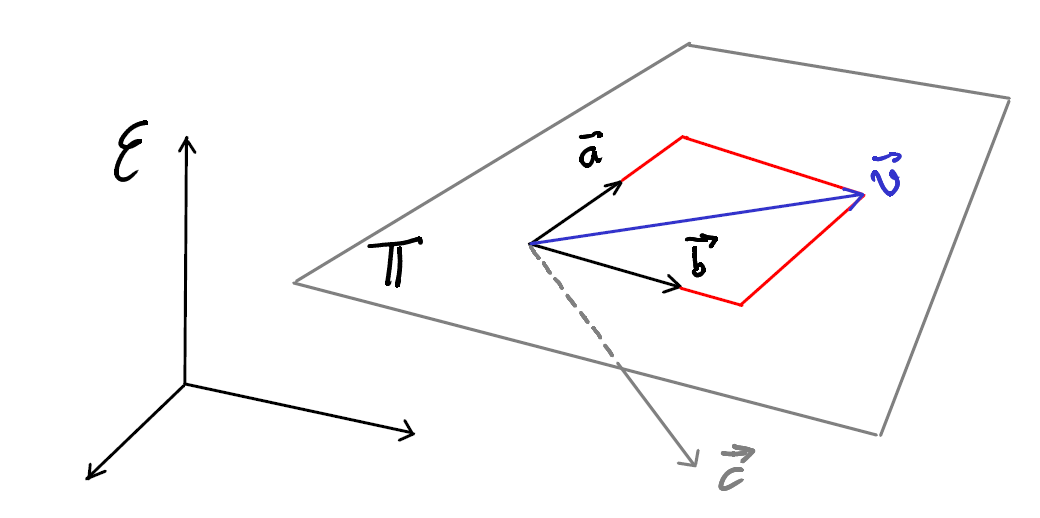 Tout point \(P(x,y,z) \in \pi\) est alors une combinaison linéaire des vecteurs \(\vec{u}\) et \(\vec{v}\).