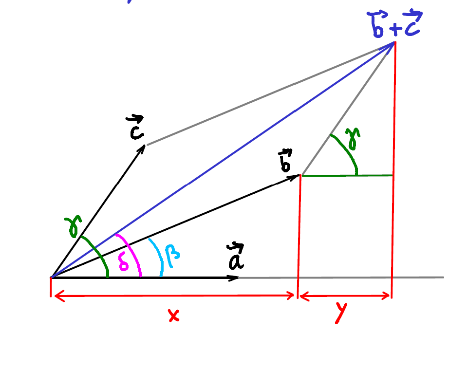 \[ \begin{align*} & \vec{a} \cdot (\vec{b} + \vec{c}) = \|\vec{b} + \vec{c} \| \cdot \|\vec{a} \| \cdot \cos\delta \space \\&\text{ avec } \quad \|\vec{b} + \vec{c} \| = x + y \\\\ \Rightarrow \quad& \vec{a} \cdot (\vec{b} + \vec{c}) = \|\vec{a} \| \cdot (x+y) = \|\vec{a}\| \cdot x + \|\vec{a} \| \cdot y\\\\ &\text{On sait aussi que } \left\{ \begin{array}{ll} x= \|\vec{b} \| \cdot \cos\beta \\y= \|\vec{c} \| \cdot \cos\gamma \end{array} \right. \\\\ \Rightarrow \quad & \vec{a} \cdot (\vec{b} + \vec{c}) = \underbrace{\|\vec{a} \| \cdot \|\vec{b} \| \cdot \cos\beta }_{\vec{a} \cdot \vec{b} } + \underbrace{\|\vec{a} \| \cdot \|\vec{c} \| \cdot \cos\gamma }_{\vec{a} \cdot \vec{c} } \\\\ \Rightarrow \quad & \vec{a} \cdot (\vec{b} + \vec{c}) = \vec{a} \cdot \vec{b} + \vec{a} \cdot \vec{c} \quad \Box \end{align*} \]