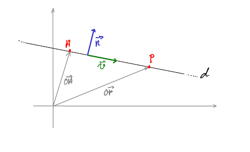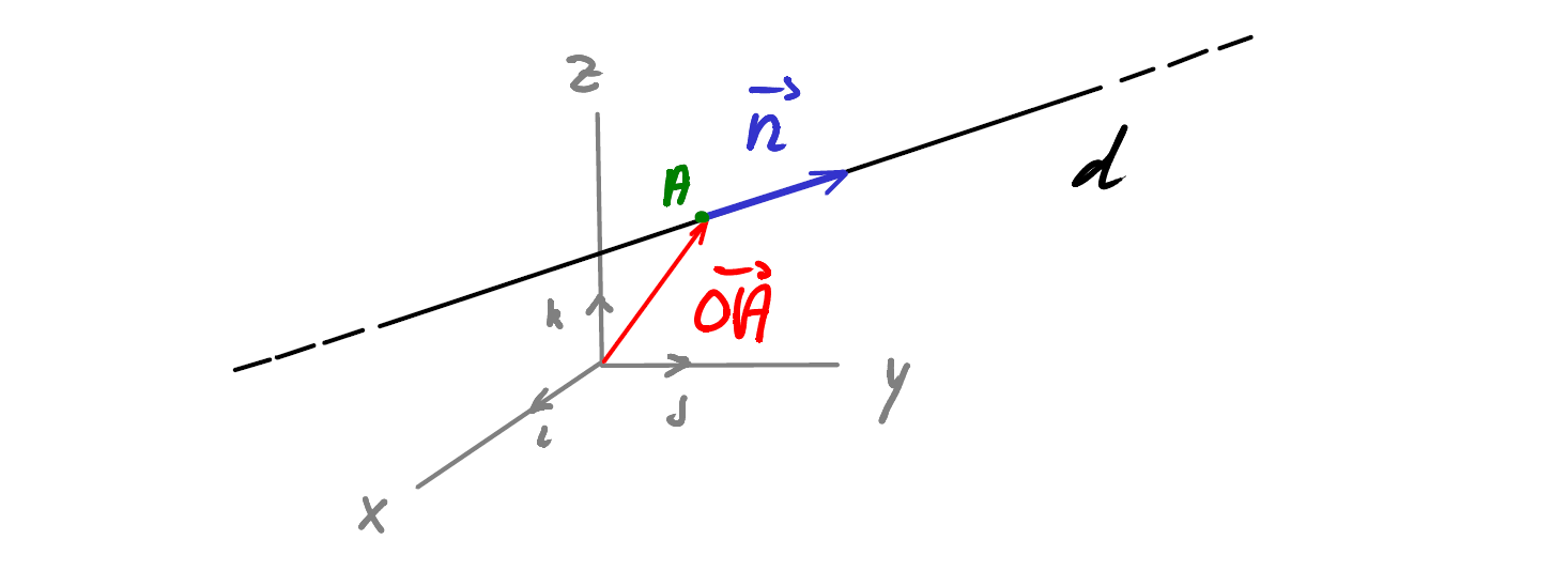Soient \(A(a_1,a_2,a_3)\) et \(\vec{n} =\begin{pmatrix}n_1\\n_2\\n_3\end{pmatrix}\), alors tout point \(P(x,y,z) \in d\) s’écrira comme étant :