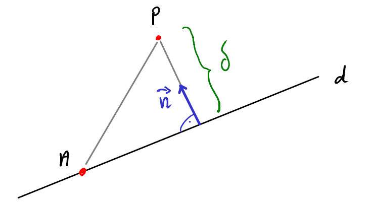 \[ \boxed{ \quad \delta = \vert{\overrightarrow{AP}\cdot \frac{\vec{n} }{\| \vec{n} \|}}\vert \quad} \]