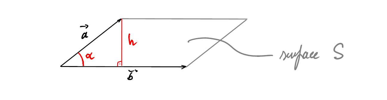 \[ \begin{align*} \left . \begin{array}{l} h = \| \vec{a} \| \cdot \sin\alpha \\ S= \|\vec{b} \| \cdot h \end{array} \right\} \quad \Rightarrow \quad S&= \|\vec{a} \| \cdot \|\vec{b} \| \cdot \sin\alpha =\| \vec{a}\times\vec{b}\| \end{align*} \]