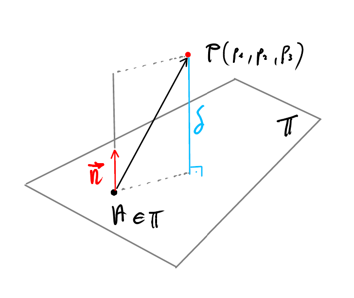 La distance \(\delta\) entre le point \(P(p_1,p_2,p_3)\) et le plan \(\pi\) est la longueur de la projection orthogonale du vecteur \(\overrightarrow{AP}\) dans la direction du vecteur \(\vec{n}\).