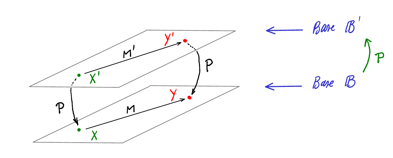 Par exemple, On voit que \(Y' = \textcolor{blue}{M'} X'\) mais aussi \(Y'=\textcolor{blue}{P^{-1}MP}X'\), ainsi on en déduit que \(M'=P^{-1}MP\).