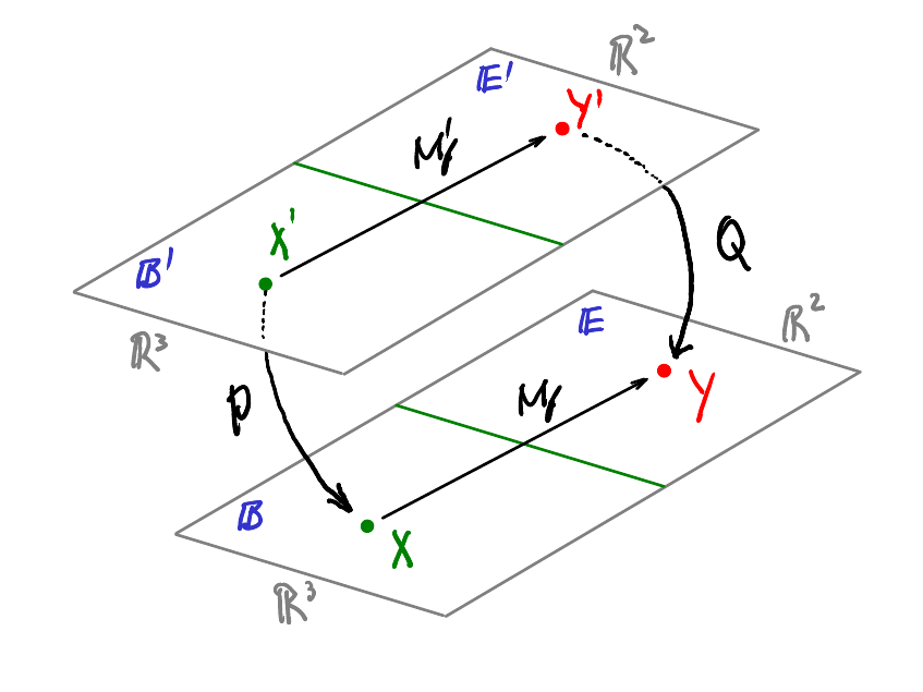 \[ Y' = M'_f X' \quad\text{avec}\quad\begin{array}{l}Y'\in\mathbb{R}^2 \text{ composantes de $y$ dans la base } \mathcal{B}'_2\\X'\in\mathbb{R}^3 \text{ composantes de $x$ dans la base }\mathcal{B}'_3\end{array} \]