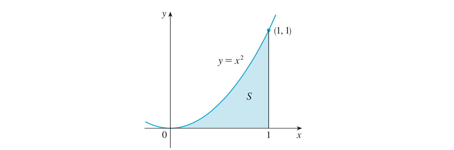 de tous les points compris entre l’axe \(x\), la parabole d’équation \(y=x^2\) et les droites verticales d’équations \(x=0\) et \(x=1\). On cherche à déterminer l’aire \(A\) de la région \(S\).