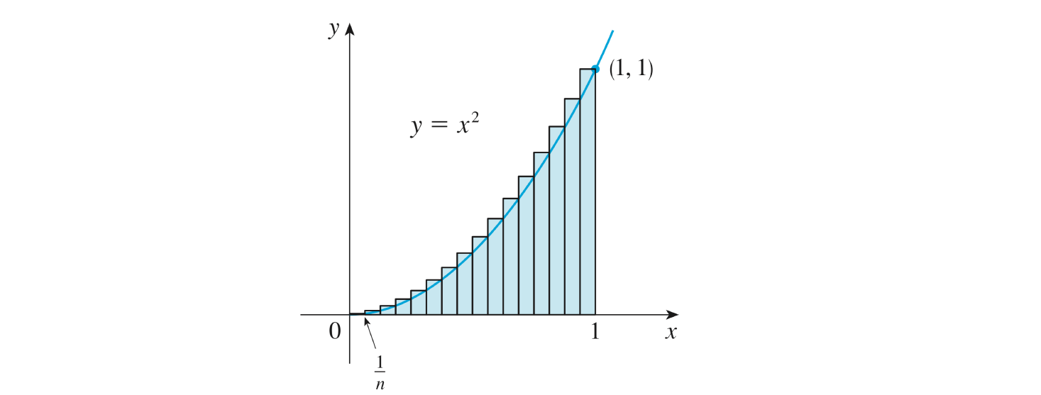L’approximation de l’aire à droite de la région \(S\) est donnée par la somme des \(n\) rectangles \(S_1,S_2, ... ,S_n\), des rectangles de même largeur et de hauteur égale au coin supérieur droit de chaque tranche :