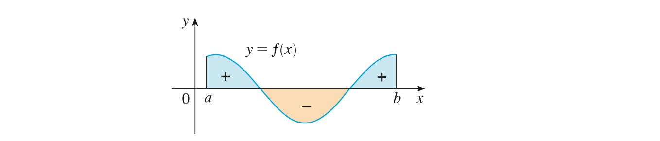 Dans le cas où la fonction \(f\) prend à la fois des valeurs positives et négatives, alors la somme \(\sum_{i=1}^{n} f(x_i) \cdot \Delta x\) additionne les aires au dessus de l’axe \(x\) et soustrait les aires en dessous.