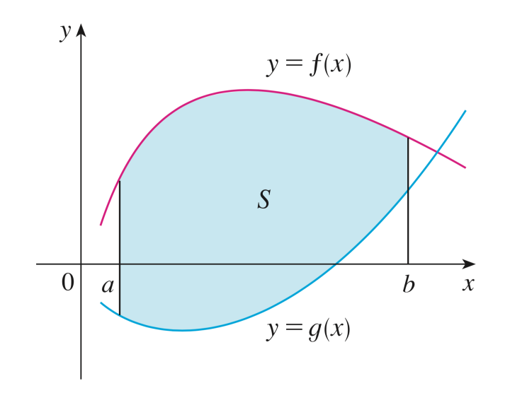 la région bornée située entre les graphes de \(f\) et de \(g\) ainsi qu’entre les droites verticales d’équations \(x=a\) et \(x=b\). Alors l’aire \(A\) de la région \(S\) est donnée par :