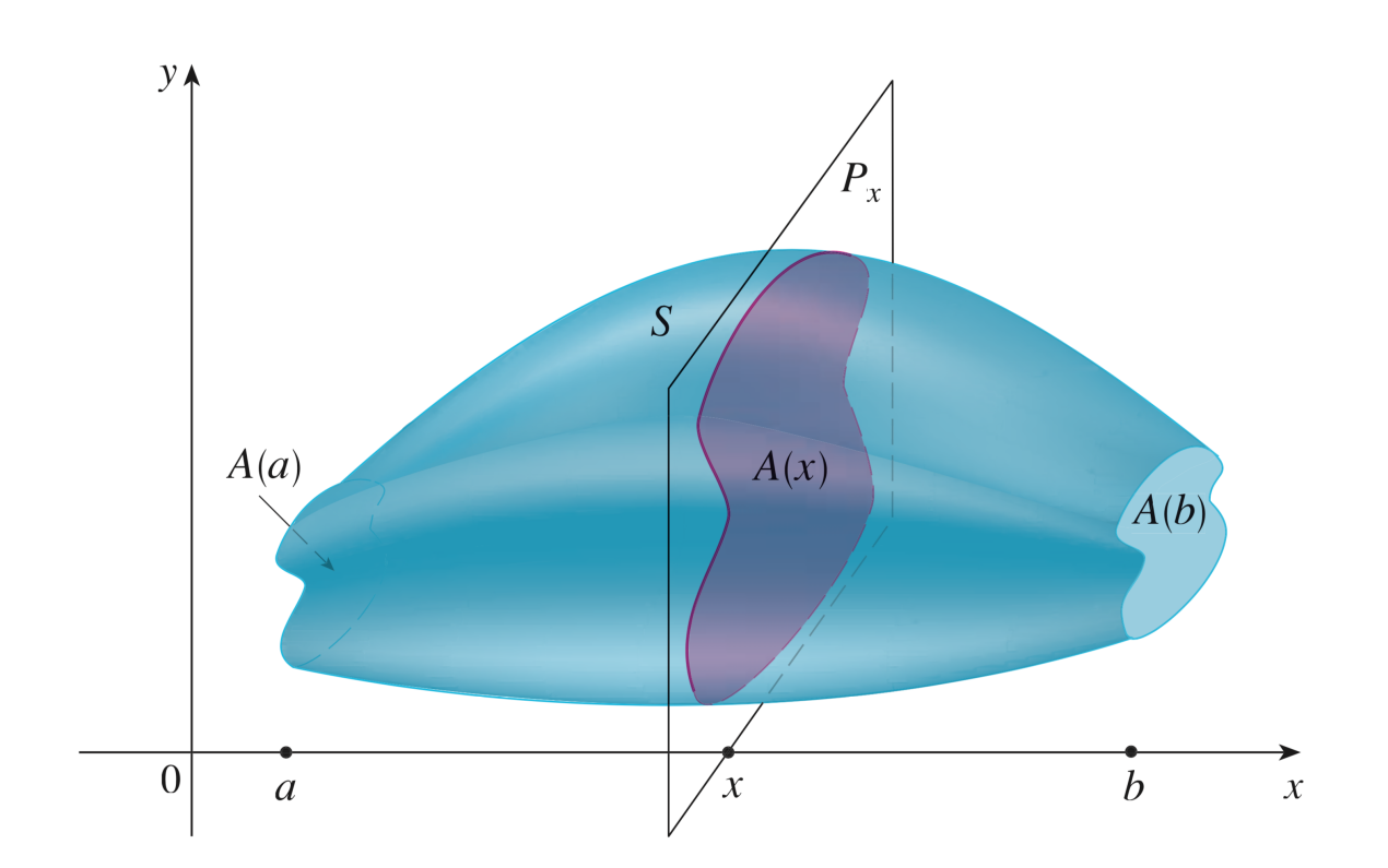 Soit \(S \subset \mathbb{R}^3\) un solide se trouvant entre \(x=a\) et \(x=b\) et soit \(P_x\) le plan perpendiculaire à l’axe \(x\) passant par le point \(x\). Soit \(A(x)\) l’aire de la section transversale \(S \cap P_x\). Le volume de \(S\) est alors défini par :
