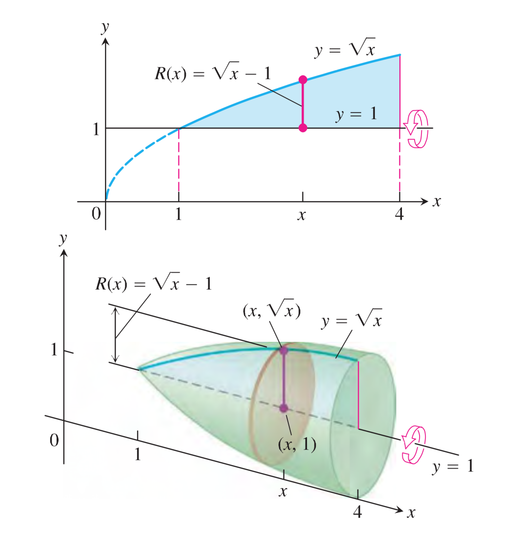 On fait tourner autour de la droite d’équation \(y=1\) la région bornée comprise entre la courbe d’équation \(y=\sqrt{x}\) et les droites d’équations \(y=1\) et \(x=4\). On cherche à calculer le volume du solide de révolution ainsi obtenu.